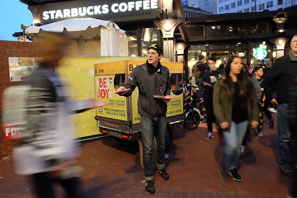 Provides easy access to pedestrian traffic by brand ambassadors in the heart of bustling downtown Portland.